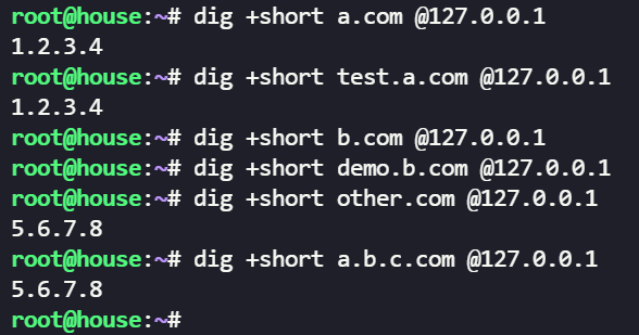 dnsmasq -d --bind-interfaces --listen-address=127.0.0.1 -A /a.com/1.2.3.4 -A /b.com/ -A /#/5.6.7.8本地没有配置的域名(本地配置优先,可以覆盖公网解析),dnsmasq 可以向上游 DNS 服务器请求解析。