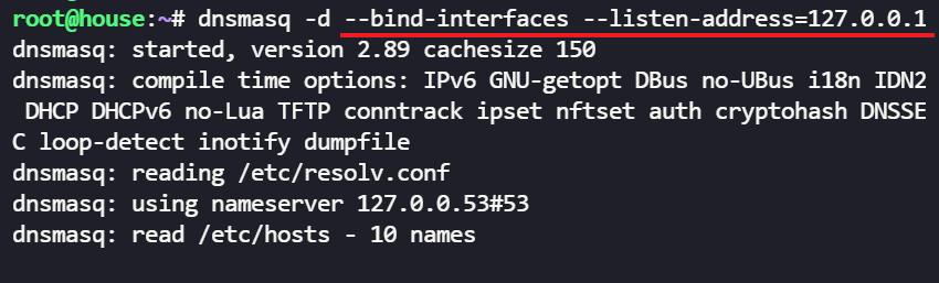 dnsmasq -d --bind-interfaces --listen-address=127.0.0.1--listen-address=<ip> 指定侦听的 IP 地址列表。也可以用--interface 参数指定侦听的网卡接口列表 (默认会添加 lo 接口)。