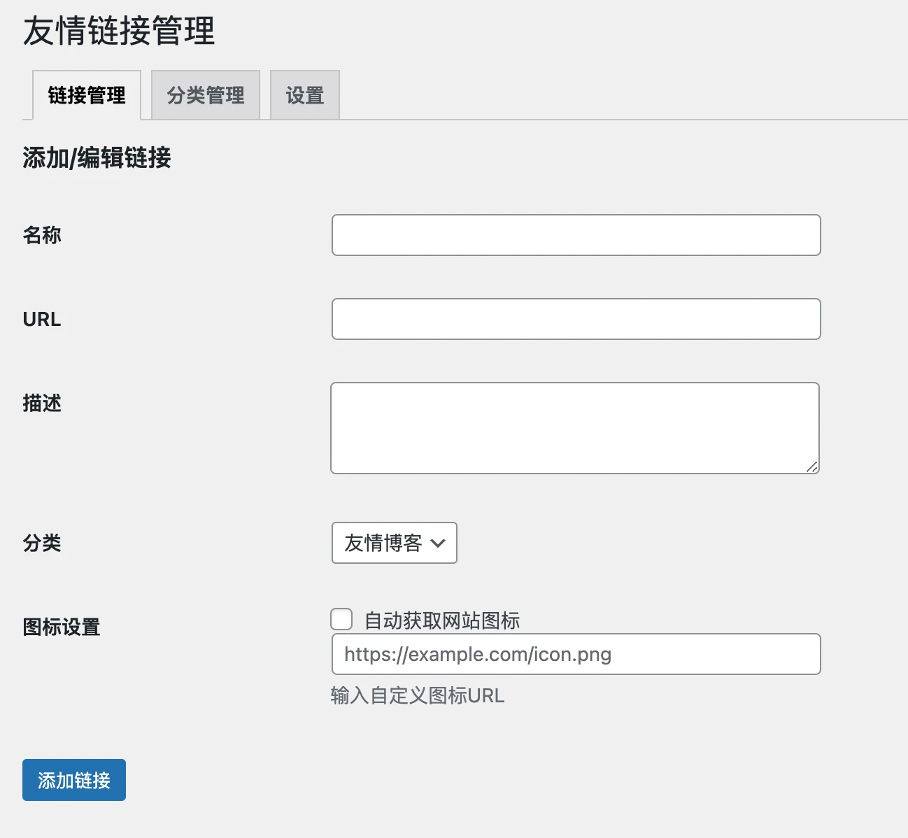 1 友情链接添加 ,添加自动获取网站图标,支持填写友情链接源头网站 Favicon 图标。
